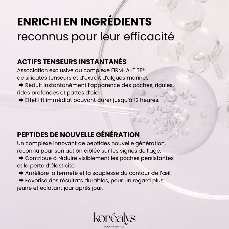 un complexe puissant d'ingrédients qui contribue à raffermir et lifter rapidement le contour des yeux, en atténuant les ridules, les poches et les pattes d'oie.